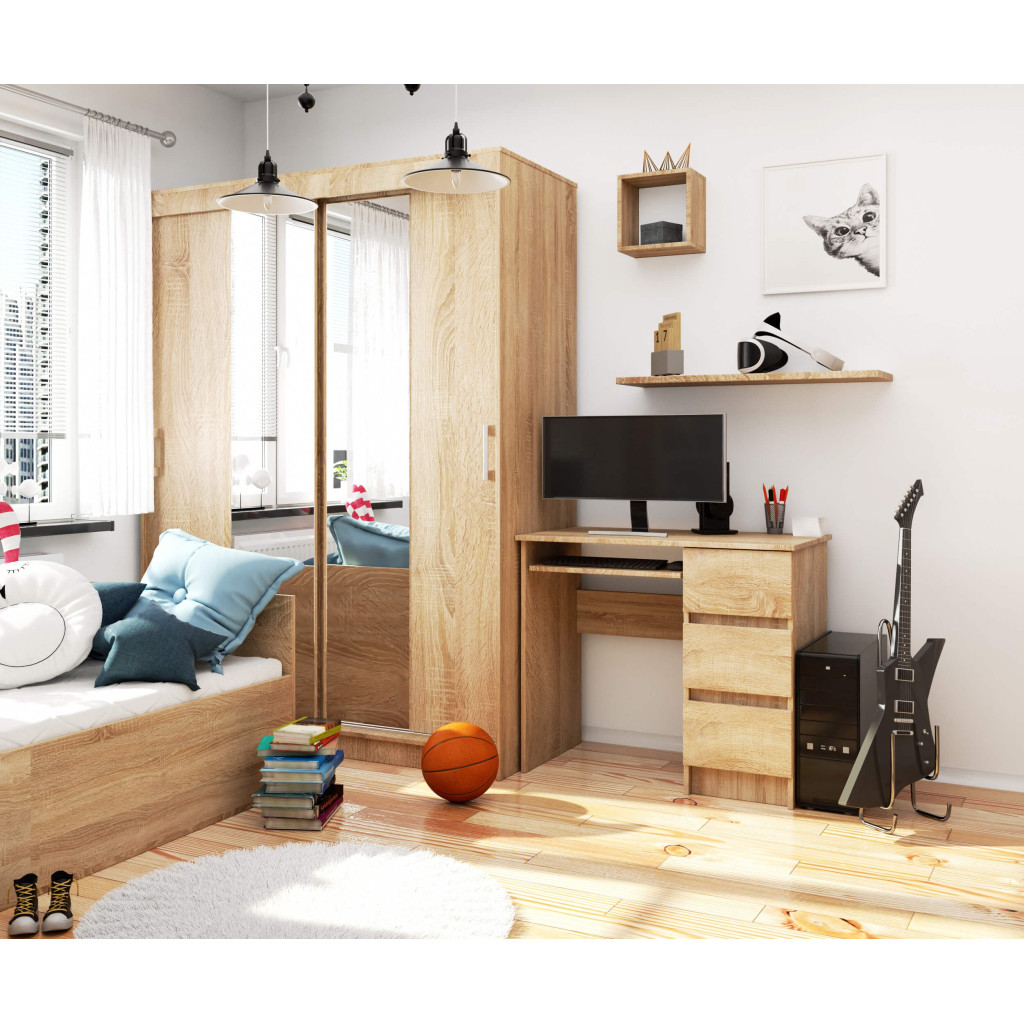 Prezentowane biurko komputerowe A-6 SONOMA PRAWE to idealne rozwiązanie dla osób, które cenią sobie funkcjonalność, a jednocześnie nie chcą, aby mebel był zbyt dużych rozmiarów. Jego wymiary to: 90 cm długości, 77 cm wysokości i 50 cm głębokości. Biurko zostało wykonane z wysokiej jakości płyty laminowanej, która odporna jest na ścieranie. Z kolei widoczne krawędzie oklejone zostały obrzeżem ABS, co gwarantuje wyższą odporność na uszkodzenia. Mebel cechuje się więc dużą trwałością. Jego zaletą jest również funkcjonalność. Biurko posiada trzy szuflady i półkę pod klawiaturę, która porusza się na metalowych prowadnicach rolkowych. Wewnątrz każdych drzwiczek znajduje się jednak półka. W efekcie użytkownik posiada wiele wolnej przestrzeni do dowolnego zagospodarowania.