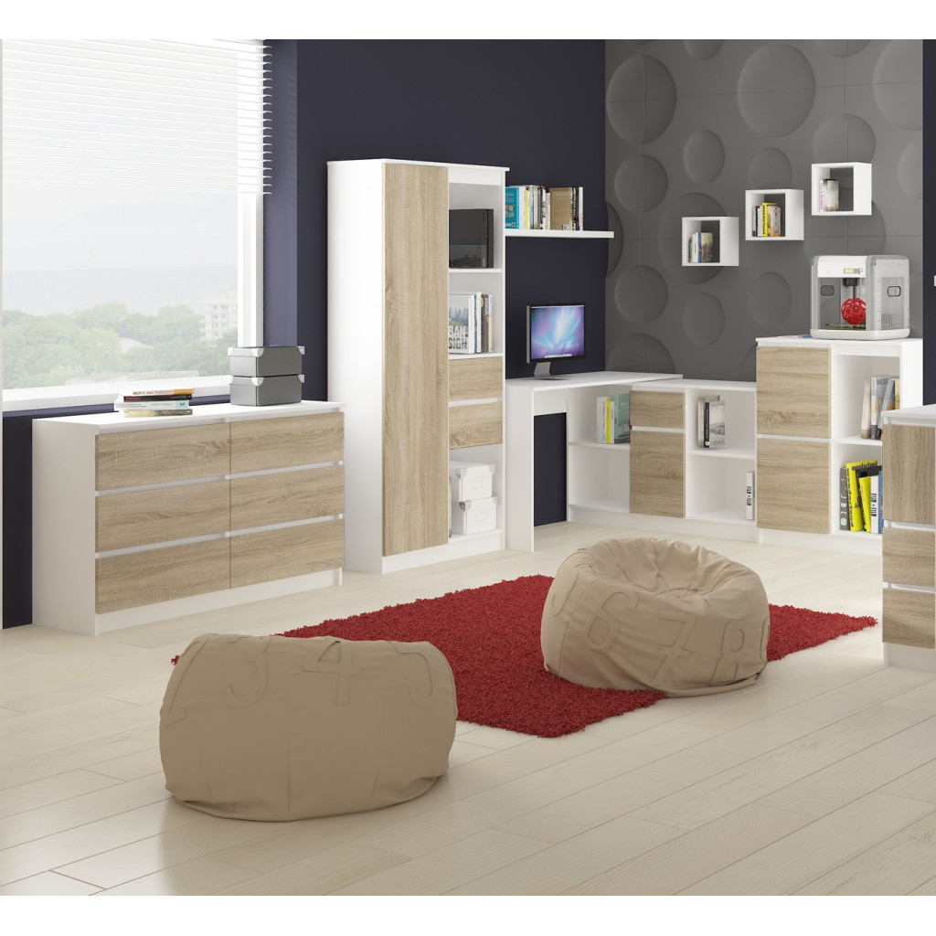 Kolor biurka jest biały, poza frontami szuflad, które są barwy dębu sodoma. Dzięki temu wyróżnia się ono swoją niebanalnością, zwłaszcza na tle mebli jednokolorowych. Idealnie sprawdzi się we wnętrzach o minimalistycznym wystroju. Biurko charakteryzuje się wysoką trwałością. Oferujemy 24 miesięczny okres gwarancyjny. Z pewnością użytkownicy komputera docenią funkcjonalność i wysoką jakość prezentowanego biurka.