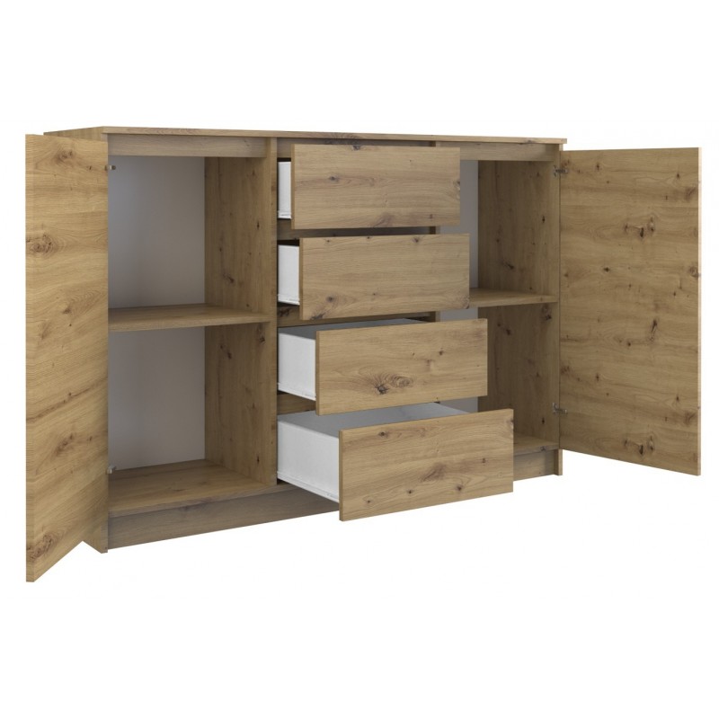 Wnętrze komody składa się z półek oraz czterech szuflad, które pomogą przy rozmieszczaniu rzeczy. Łatwiej będzie znaleźć to, czego się szuka.