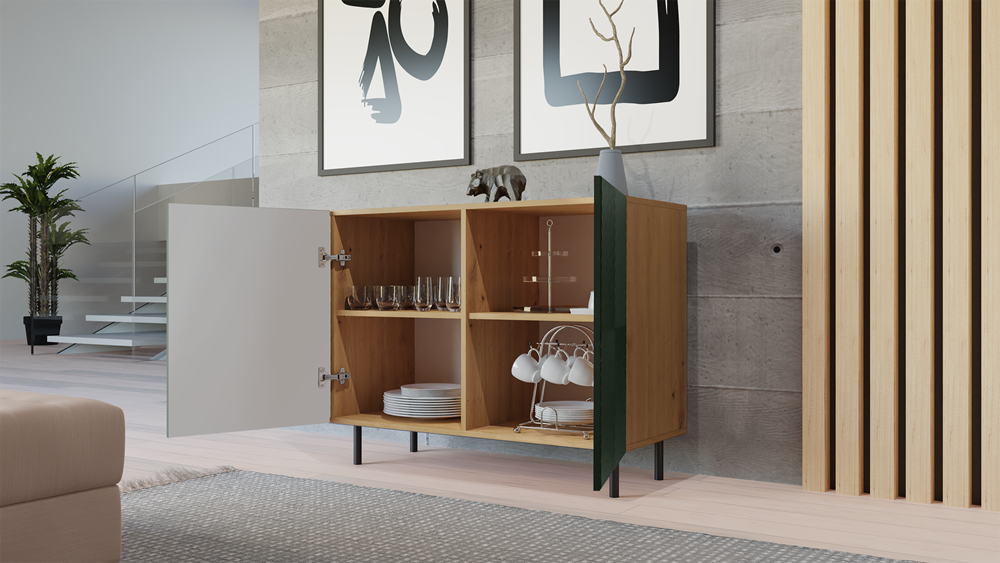 • System TIP-ON drzwi komody – otwierają się po delikatnym naciśnięciu frontu za pomocą mechanicznego wspomagania otwierania.