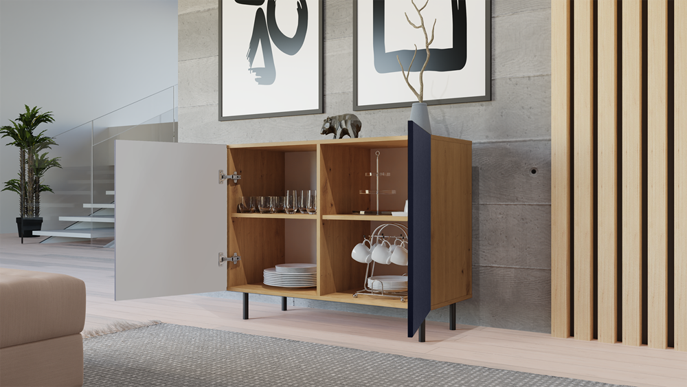 Dużym atutem są okrągłe metalowe nogi o wysokości 13 cm, które nadają wizualnej lekkości całej konstrukcji i sprawiają, że komoda jest stabilna.