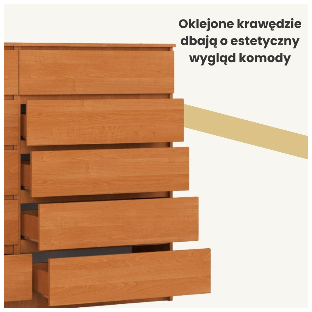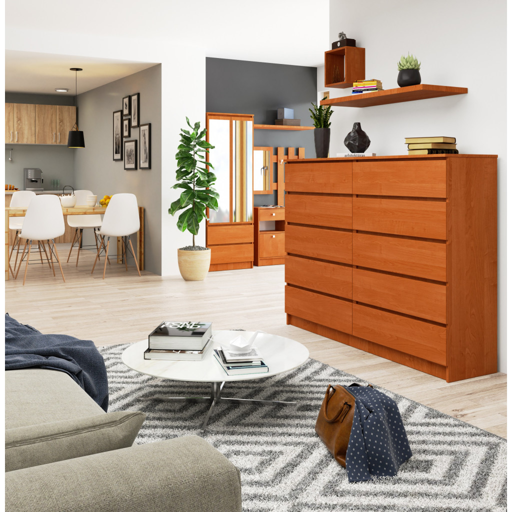 Komoda składa się aż z 10 szuflad, daje więc wiele wolnych przestrzeni go zagospodarowania. Wszystkie szuflady poruszają się gładko i cicho za sprawą metalowych prowadnic rolkowych. Mebel jest więc bardzo funkcjonalny. Jednocześnie nienagannie się prezentuje. Jest prosty w formie, dopasować można więc go do różnego typu pomieszczeń i ich aranżacji.
