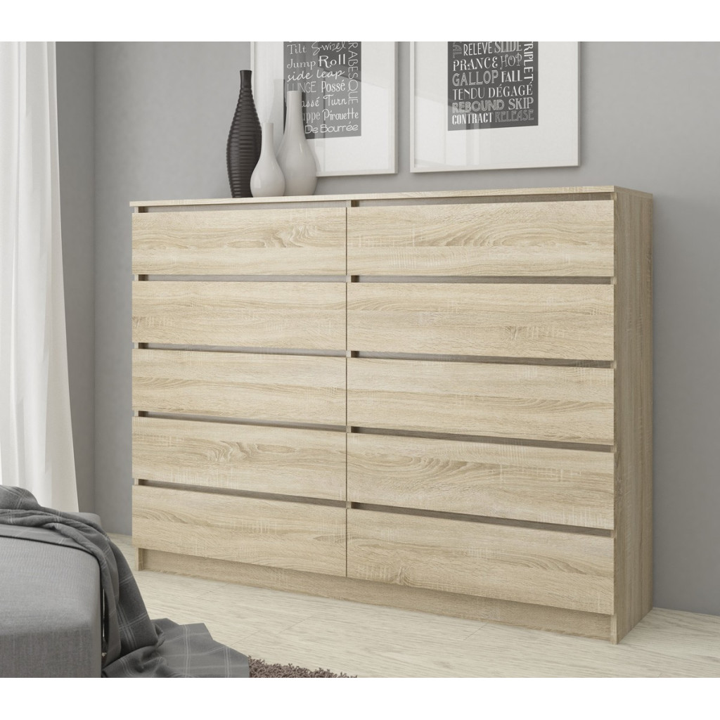 Komoda K60 w kolorze dąb sonoma to idealna propozycja skierowana do wszystkich klientów naszego sklepu internetowego, którzy są zainteresowaniu nabyciem dużego mebla przeznaczonego do przechowywania różnego rodzaju artykułów niezbędnych w danym pomieszczeniu. Prezentowana komoda, której cechami charakterystycznymi są uniwersalny, ponadczasowy design oraz znakomita jakość, została wyposażona w aż dziesięć szuflad. Bezproblemowa w codziennym użytkowaniu, a także łatwa w czyszczeniu propozycja na pewno zadowoli klientów celujących w nowoczesne, proste, ale przy tym eleganckie rozwiązania. Komoda znajdzie zastosowanie między innymi w pokojach dziennych czy sypialniach, ale także pokojach hotelowych bądź wnętrzach o charakterze biurowym. Na uwagę zasługuje również konkurencyjna cena solidnie wykonanego produktu.