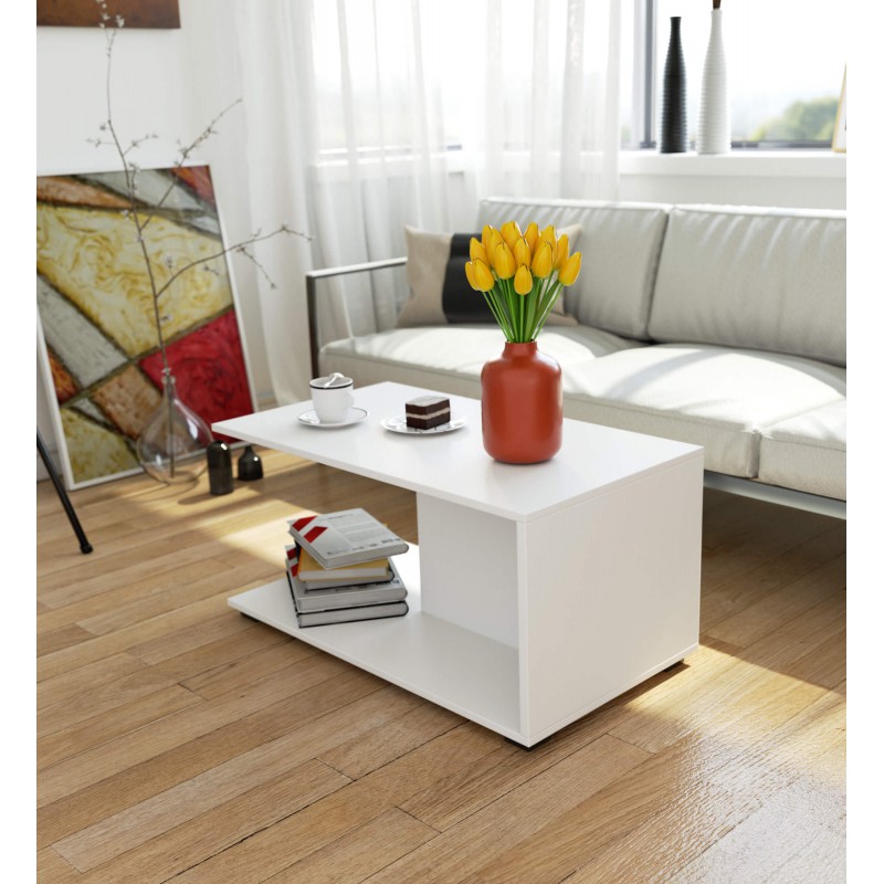 Biały stolik kawowy stanowi udane połączenie funkcjonalności i atrakcyjności wizualnej. Mebel będzie pasował do pokoju dziennego urządzonego zarówno w stylu klasycznym, jak i nowoczesnym. Stolik kawowy 90cm został wykonany z wysokiej jakości płyty laminowanej, dzięki czemu jest odporny na ścieranie. Ławę można często czyścić na mokro, bez obawy zniszczenia jej blatu. Niewielki rozmiar stolika sprawia, że równie dobrze nadaje się on do postawienia w salonie o małej, jak i o dużej powierzchni. Przy stoliku kawowym można pić wygodnie kawę i herbatę, a także czytać książki i gazety lub spędzać wolny czas, grając w gry planszowe. Ława do salonu jest wyposażona w dodatkową dolną półkę wielkości górnego blatu, co znacznie podnosi jej funkcjonalność. Półkę można przeznaczyć na czasopisma czy płyty albo jej przestrzeni w ogóle nie zagospodarowywać, by zawsze mieć do dyspozycji poręczne miejsce na odłożenie jakiejś rzeczy, np. robótki ręcznej. Stolik kawowy można także wykorzystać do celów dekoracyjnych, ustawiając na nim designerską lampę lub kompozycję kwiatową.