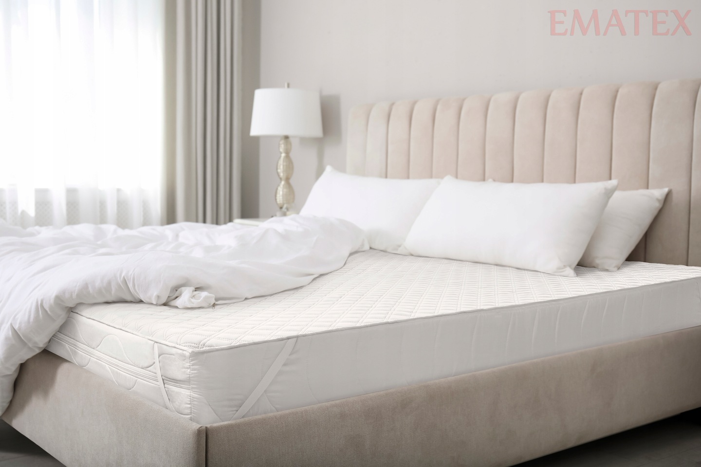 GÓRNA WARSTWA ochraniacza to najwyższej jakości neutralna i nie uczulająca skóry, miękka pikowana 100% Poliestrowa tkanina antyalergiczna, która jest przyjemna w dotyku. Pikowanie przy użyciu nowoczesnych maszyn ultradźwiękowych, wzmacnia strukturę wypełnienia i czyni ochraniacz bardziej komfortowym. Produkt jest całkowicie wolny od substancji szkodliwych dla zdrowia, i jest bezpieczny dla dzieci.