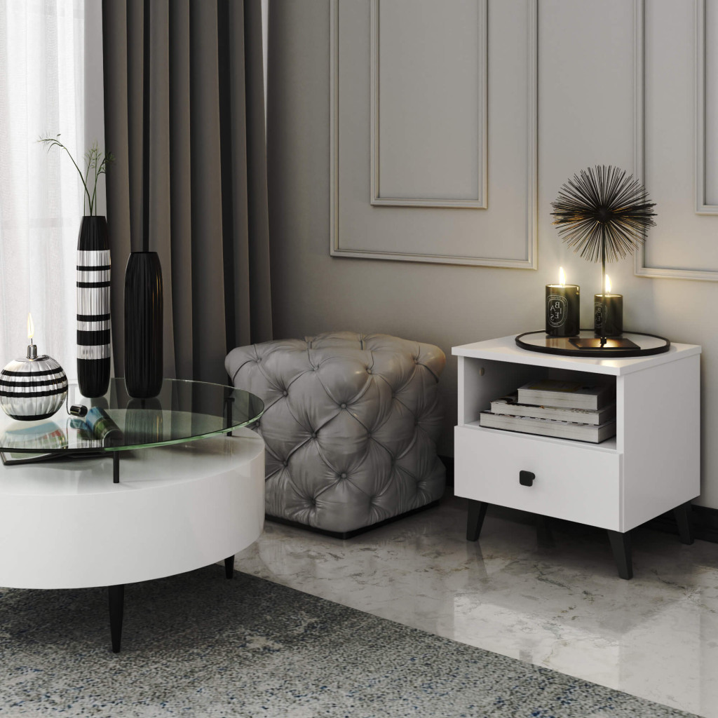 Szafka nocna biała z czarnymi uchwytami MOBI K-01 to kompaktowy mebel o bogatym charakterze. Połączenie bieli i czerni nadaje mu wyrafinowany wygląd. Mała szuflada przyda się do przechowywania rozmaitych drobiazgów, a otwarta półka do odkładania często używanych przedmiotów, np. telefonu, okularów czy ulubionej książki.