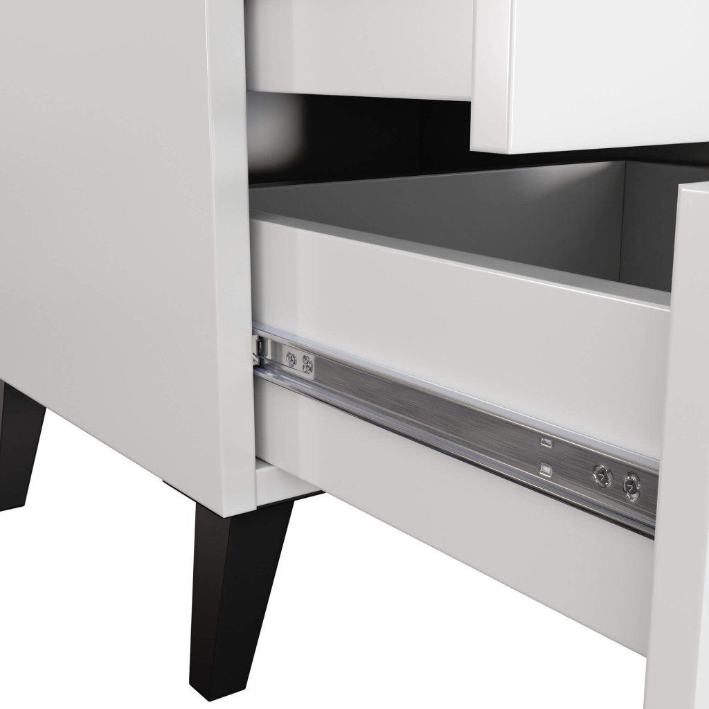Szafka nocna 40 cm biała MOBI K-03 z czarnymi uchwytami i nóżkami łączy w sobie prostą i zgrabną formę, elegancję oraz funkcjonalność. Wyposażona w 3 szuflady, może również pełnić rolę małej komody do salonu lub przedpokoju. Dzięki szerokości 40 cm, szafka nocna MOBI K-03 nie zajmie dużej przestrzeni i zmieści się w każdym pomieszczeniu. Do szafki dołączony jest kątownik oraz wkręty, które umożliwiają przymocowanie mebla do ściany.